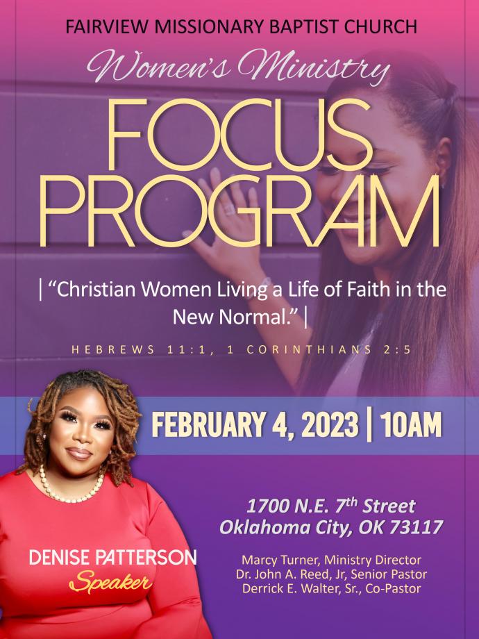 CALLING ALL WOMEN! (Men are welcome!!) February 4, 2023, 10:00 am Plan to attend Fairview Women Ministry's 2023 Ministry Focus Program. Spread the word. Bring a friend!! ![]() Event Contact Info:
