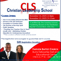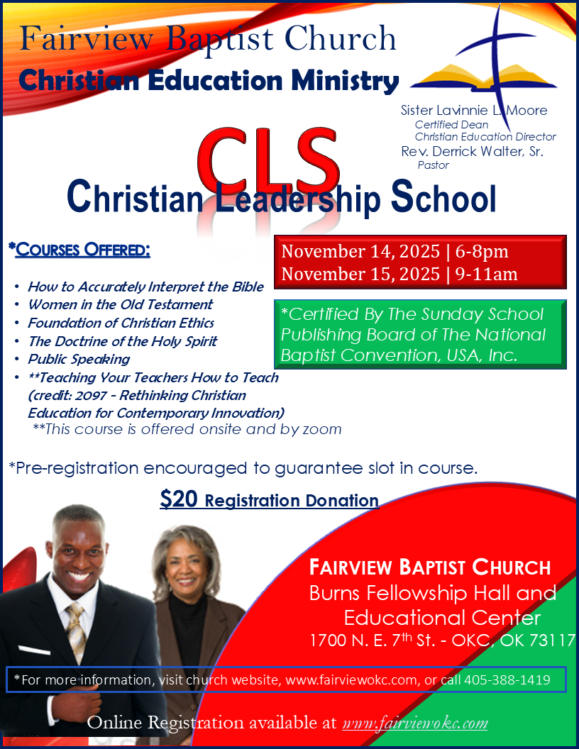 Fairview Missionary Baptist Church will host a Christian Leadership School (CLS), November 14  and 15, 2025.  The School has been approved and accredited by the Sunday School Publishing Board of The National Baptist Convention, USA, Incorporated.