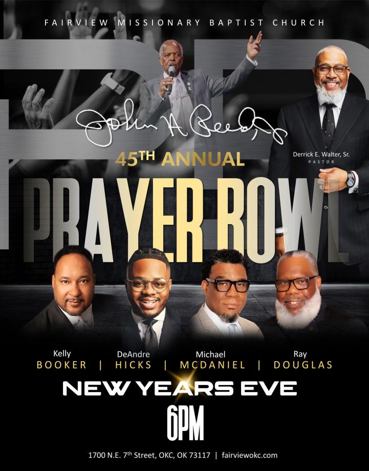 Fairview's John A. Reed, Jr. 45th Annual Prayer, named for the Late Pastor, Dr. John A. Reed, Jr., will be held on December 31, 2025, beginning at 6pm. The theme is "Proclaiming the Gospel to Rebuild Our Culture." (2 Timothy 4:2)December 31, 2025 . 6:00 pm - 7:00 pm The Prayer Bowl will begin at 6pm. A different preacher and church is scheduled each hour. This year's schedule is as follows: